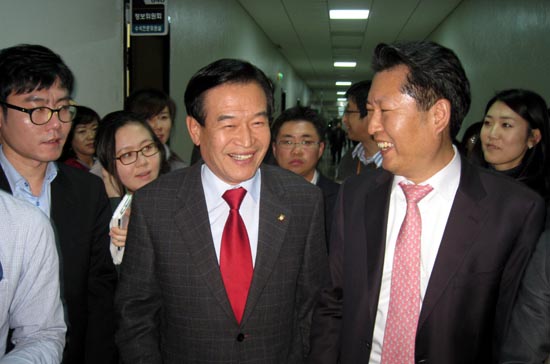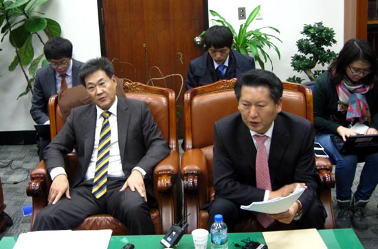 ▲ 정문헌 새누리당 의원(왼쪽)과 정청래 민주당 의원이 13일 국회 정보위원회 회의 내용을 중간 발표하고 있다. [사진 - 통일뉴스 김치관 기자]
