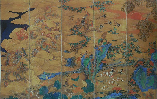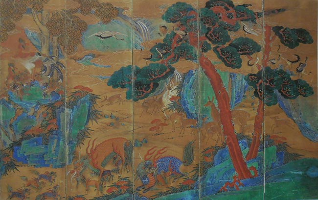 영기(靈氣)를 내뿜는 거북, 청색, 황색의 날개를 가진 학, 크고 아름다운 뿔과 상징화된 등 갈기, 흰색, 갈색, 회색의 사슴 따위의 표현은 그것을 말해준다.