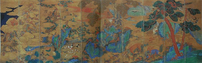 그런데 이 그림에는 용, 기린, 봉황, 거북과 같은 상상 속의 동물과 함께 현실 속의 동물인 학, 사슴, 공작, 원앙도 등장한다.