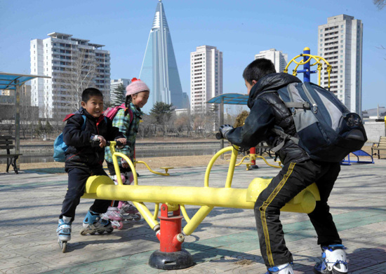 ▲ 시소 놀이 즐기는 북측 아이들. 뒤로 삼각형 모양의 류경호텔이 보인다. [사진 제공-정기열]
