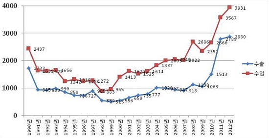 지난달 29일 코트라(KOTRA)가 발표한 '2012년도 북한의 대외무역동향'에 따르면, 북한의 수출은 전년대비 3.3% 증가한 28억 8천만 달러, 수입은 전년대비 10.2% 증가한 39억 3천만 달러로 무역수지는 10억 5천만 달러의 무역적자를 기록했다.