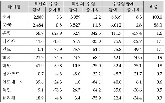 한편, 지난해 남북교역은 19억 7천만 달러로, 대북 반입 10억 7천만 달러, 반출 8억 9천만 달러로 집계됐으며, 이를 포함할 경우, 북한의 대외무역에서 중국이 차지하는 비중은 68.4%, 한국은 22.4%이다.