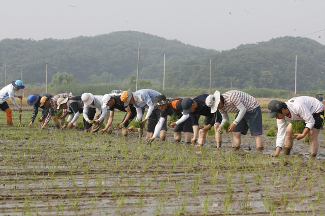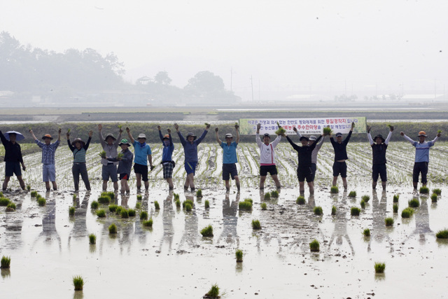 6.15남측위원회 광주전남본부와 전국농민회총연맹 광주시농민회 회원들이 지난 6일 오전 광주광역시 광산구 송산동 들녘에서 ‘통일쌀 모내기’를 하고 있다.