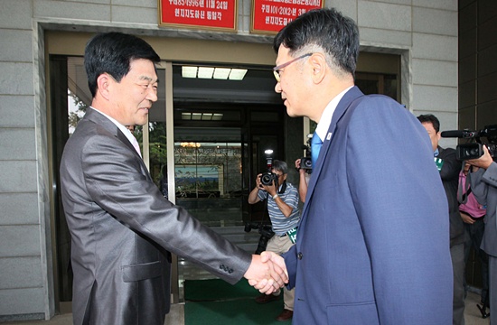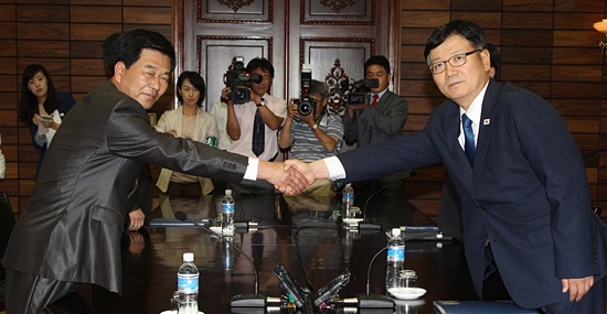 | [모두발언] 박철수 북측 수석대표 : 장마철인데 서울 날씨는 어떻습니까. 서호 남측 수석대표 : 서울이 장마 기간 중입니다. 우리 단장 선생님 많이 젊어지신 것 같습니다. 박철수 : 서 선생도 모습이 크게 변하지 않았습니다. 서호 : 네. 우리 개성공업지구와 관한한 사실 북측에서 가장 전문가가 박철수 단장 선생이라고 알고 있고, 또.. 박철수 : 피차 일반입니다 서 단장님이 전문가시니.. 서호 : 또 개성공단에 대해서는 많은 애정을 가지고 계실 겁니다. 다만 지금 개성공업지구 가동이 중단된 엄중한 상황에 놓여있어서 마음이 무겁고 착찹한 심정입니다. 오늘 낯이 익은 단장 선생님과 함께 개성공단 관련해서 상호 협력과 신뢰 속에서 문제를 잘 풀어나갔으면 좋겠습니다. 박철수 : 회담 날짜는 괜찮게 잡은 것 같습니다. 장마 구름이 짙은데 오늘은 이따금씩 해가 보입니다. 여러가지 문제를 토론할 수 있지만 장마철 피해대책 제일 시급합니다. 좋은 결과를 만듭시다. 이만합시다. [제공=판문점 공동취재단] |