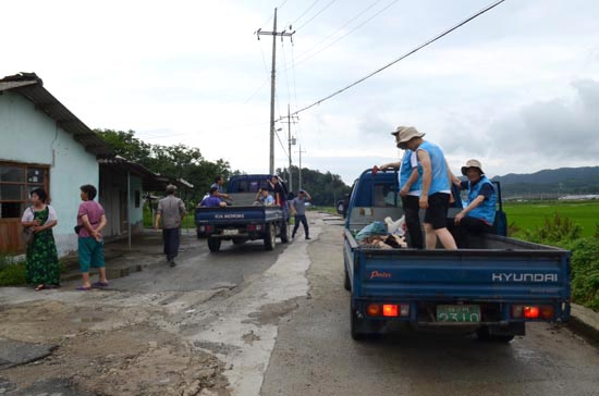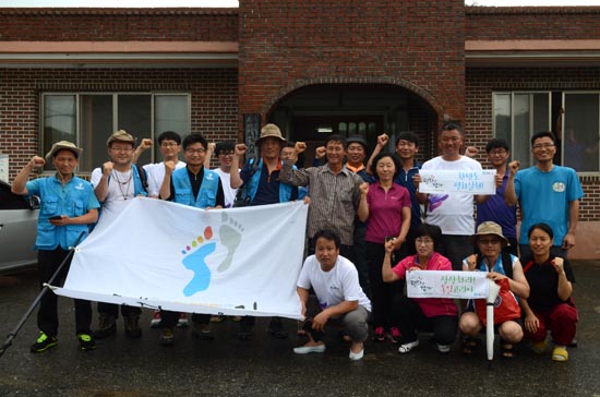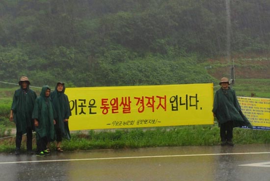 행진 5일차 7일 새벽부터 비가 오락가락하는 가운데 전농과 전남진보연대, 민노총, 진보당 지역지부 등 20여 명이 합류해 오전 농활을 시작했다. 세 팀으로 나눠 한 팀은 마을회관 안팎을 수리, 청소하고 한 팀은 호박밭으로 간다. 우리 팀은 두 군데 ‘통일쌀 경작지’를 둘러보고 홍보 펼침막을 설치했다. 중간 중간 소나기와 폭우가 쏟아져 주변 영산강이 누런 황토물로 흘렀다.