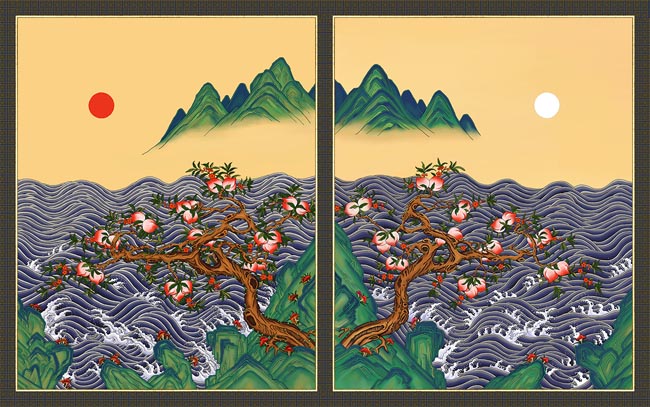 변주된 부분을 보면, 일단 오봉도의 소나무 대신 복숭아나무가 들어갔다. 또한 오봉도의 소나무가 좌우 바깥쪽에서 안쪽으로 향하지만 이 그림은 중심부분에서 바깥쪽으로 향하고 있다.