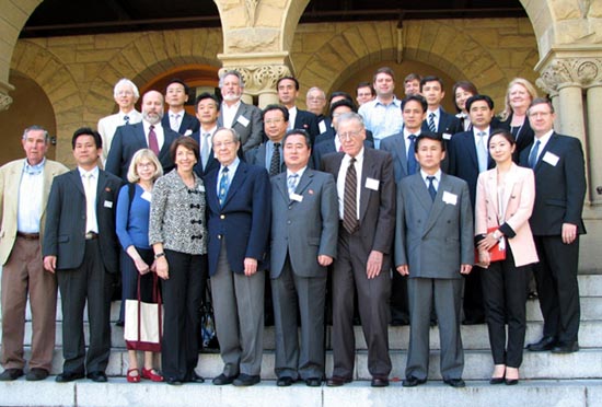 ▲ 2011년 3월 19일부터 미국을 방문한 북한 경제대표단 일행이 4월 1일 미국 캘리포니아주 스탠퍼드대 아시아․태평양연구소 앞에서 세미나가 끝난 뒤 대학 내 대북 전문가들과 기념촬영을 하고 있다. 국제안보협력센터 지그프리드 헤커 박사(맨 윗줄 왼쪽 끝), 윌리엄 페리 전 국방장관(첫째줄 왼쪽에서 다섯번째) 등이 참석했다. [자료사진 - 민족21]