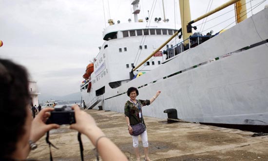 ▲ 중국관광객들이 라진항에서 금강산으로 가는 배를 타기에 앞서 기념촬영을 하고 있다. 최근 북한을 찾는 중국관광객이 연 5만명을 넘은 것으로 추산된다. 그러나 남북 간의 금강산관광은 중단된 지 오래다. [자료사진 - 민족21]