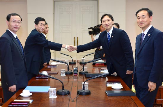▲ 첫 전체회의에 앞서 남측 이덕행 수석대표(오른쪽)와 북측 박용일 단장(왼쪽)이 악수를 나누고 있다. [사진제공 - 통일부]
