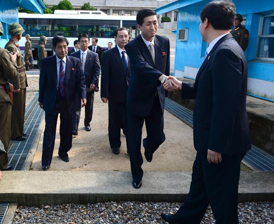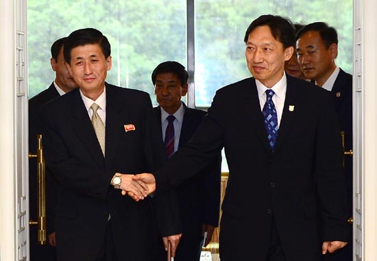 ▲ 이산가족 상봉 실무회담이 열리고 있는 판문점 남측지역 '평화의 집'에서 이덕행 남측 수석대표(오른쪽)와 박용일 북측 단장이 악수를 나누며 회담장으로 들어서고 있다. [사진제공 - 통일부]