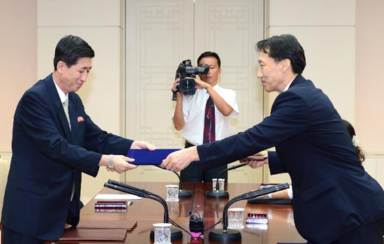 ▲ 이산가족 상봉을 위해 판문점에서 열린 남북 적십자 실무회담이 23일 합의서를 채택하고 막을 내렸다. 이덕행 남측 수석대표(오른쪽)와 박용일 북측 단장이 합의서를 교환하고 있다. [사진제공 - 통일부]