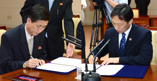 ▲ 이덕행 남측 수석대표(오른쪽)와 박용일 북측 단장이 합의서에 서명하고 있다. [사진제공 - 통일부]