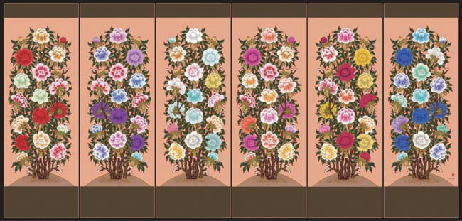 모란나무는 거의 직선으로 세워서 그렸고 꽃은 일정한 양식이 반복된다. 꽃의 색깔도 빨강, 노랑, 자주색, 흰색을 중심으로 반복된다. 두 가지 색으로만 칠해진 이파리는 앞면, 옆면, 뒷면이 한꺼번에 표현된 형식이 반복되고 이파리의 끝에는 상상의 태점이 박혀있다.
