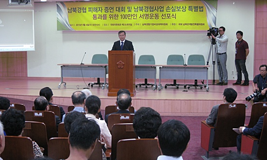 2008년 7월 '박왕자씨 사망사건'과 2010년 3월 '천안함 사건'에 따른 '5.24 조치'로 피해를 입은 남북경협기업인들이 4일 오전 10시 국회 의원회관 제2소회의실에서 '남북경협사업자 긴급지원 및 손실보상특별법안(이하 특별법안)' 통과를 위한 100만 서명운동 선포식을 갖고 서명운동에 돌입했다.