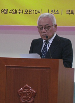 ▲ 4일 오전 국회에서 남북경협기업손실보상특별법 통과 100만인 서명운동 선포식이 열렸다. 인사말하는 유동호 비대위 위원장. [사진-통일뉴스 이광길 기자]