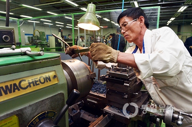 ▲선반을 다루는 숙련공의 눈길이 예사롭지 않다. [사진-개성 사진공동취재단]