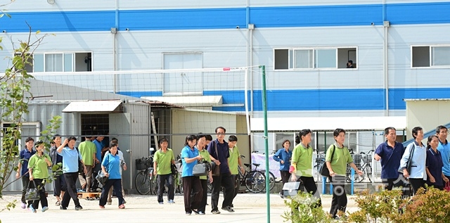 ▲167일만의 작업에도 몸은 가뿐하고 활력이 넘친다. 오전 근무를 마친 북측 근로자들이 점심식사를 위해 작업장을 나서고 있다. 개성공업지구 종합지원센터 5층에 위치한 체력단련실은 지난 16일부터 정상운영을 시작했고, 개성면세점 내 평양식당도 영업을 개시했다. [사진-개성 사진공동취재단]