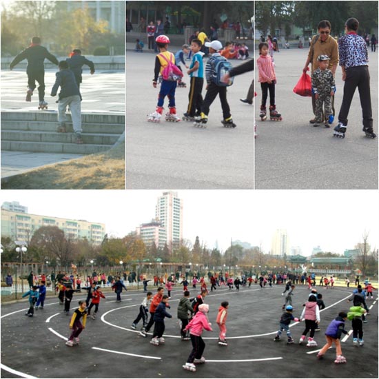 “북한 주민들의 상황은 악화일로를 걷고 있다. 그러나 평양의 모습은 다소 달랐다. 이제는 즐기며 살라고 김정은 제1위원장이 하루아침에 국훈을 바꾼 것처럼 보인다. 김정은 제1위원장은 새로운 놀이공원에 투자하고 아이스링크와 수영장 건설에도 군인 수만명을 투입시키고 있다. 또한 돌고래 수족관을 짓기 위해 황해에서 평양 도심까지 수백km에 이르는 파이프라인을 깔도록 지시했다. 주거지역엔 운동장과 배구 경기장, 인라인스케이트장이 만들어지고 있다. 현재 평양은 청소년으로 인산인해를 이루고 있다. 서방에서 들어온 것은 모두 비도덕적이라고 매도하던 북한에 1년 전부터 롤러블레이드가 등장했다.”