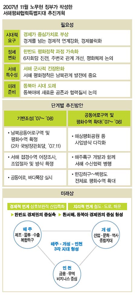 노무현 대통령 : (해주를) 특구로 보십시다. 그래서 전체를 서해 평화협력지대로 선포를 하고, 그 안에 한강하고 개발. 해주공단.. 공단이라고 해도 좋고 특구라도 해도 좋고.. 다 좋습니다. 그 안에 공동어로구역 만들고, 북쪽에 생태평화공원까지 되면..
