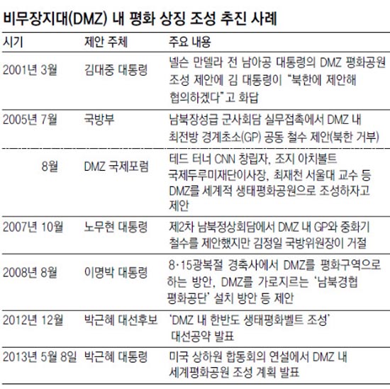 사실 DMZ 세계평화공원 조성은 김대중 정부부터 지속적으로 제안되어 왔던 사안이기에 새로울 것은 없다. 심지어 이명박 대통령조차도 2008년 8.15경축사에서 DMZ을 평화구역으로 하는 방안과 DMZ을 가로지르는 ‘남북경협평화공단’ 설치 방안을 제안했다.