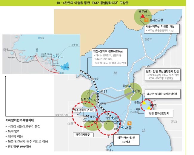 6년 전인 2007년 10월 3일 노무현 대통령은 오전과 오후의 두 차례 남북정상회담에서 남북경협과 서해평화협력지대의 필요성에 대해 장시간 설명하며 DMZ을 생태평화공원으로 조성하자는 구상을 밝혔다. 이에 대해 당시 김정일 국방위원장은 오전 회담 때만 해도 부정적 입장을 보였지만 오후 회담 때는 해주특구 개발 등 서해평화협력지대 조성을 전격 수용했다. 다만 비무장지대를 생태평화공원을 조성하자는 제안에 대해서는 정전협정을 평화협정으로 바꾸기 전에는 어렵다는 입장을 보였다.