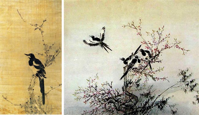 우측-김홍도/매작도(梅鵲圖)/화첩, 종이에 담채/26.6*31.4/간송미술관 소장.