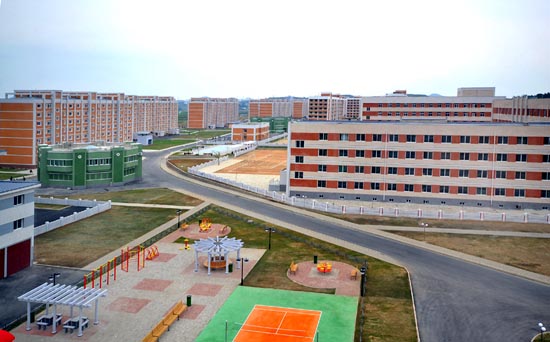 ▲ 지난 9월 준공식을 가진 과학자와 기술자들을 위한 평양 은하과학자거리의 모습. 이 거리에는 1,000여 세대에 이르는 21개 동의 다층살림집(아파트)과 학교, 병원, 탁아소, 유치원 등 공공건물들, 아동공원, 소공원, 각종 편의봉사시설 등이 들어섰다. [자료사진 - 민족21]