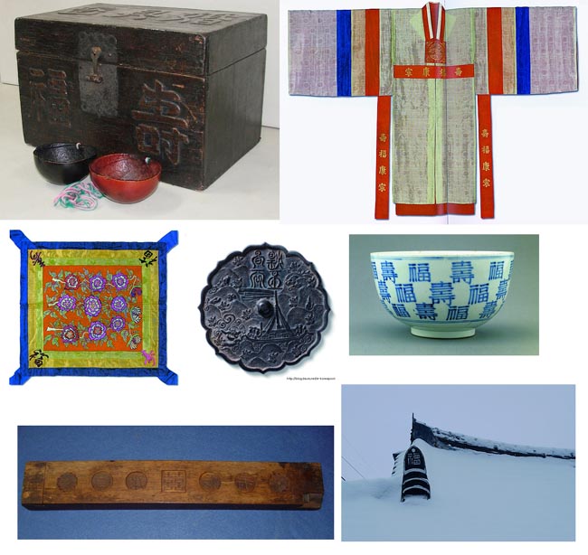 우리민족만큼 ‘수복(壽福)’에 미쳐있는 나라는 단연 중국이다. 중국에서는 어딜 가든 수복이란 글자를 볼 수 있다. 의복이나 식기, 가구와 같은 생활품, 장신구나 노리개와 같은 공예품에도 수복이란 글자가 들어가 있고 성벽이나 담벼락, 기둥 따위에서 커다랗게 수복이란 글자를 붙여 놓는다.