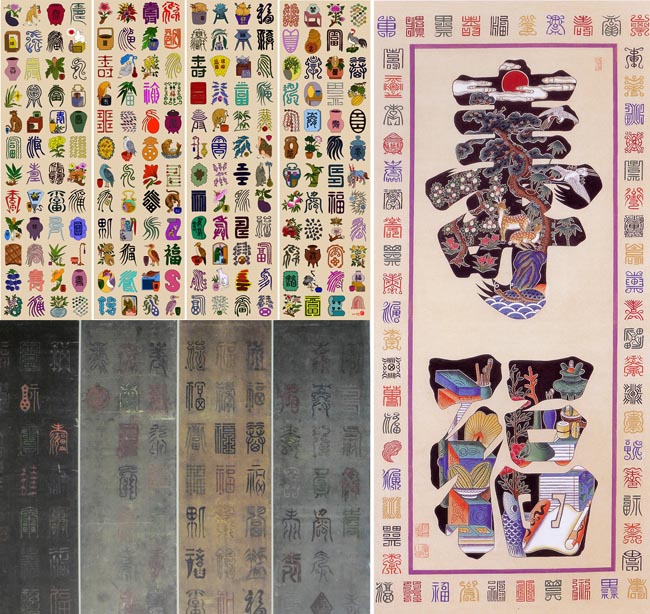 ‘수복(壽福)’이란 글자에 여러 장식을 더해 그림을 그렸으며, 글자와 형상을 결합해 ‘백수백복도’를 창작했다. ‘수복(壽福)’이란 글자를 자유자재로 변형해 추상그림의 경지까지 올려놓았다.