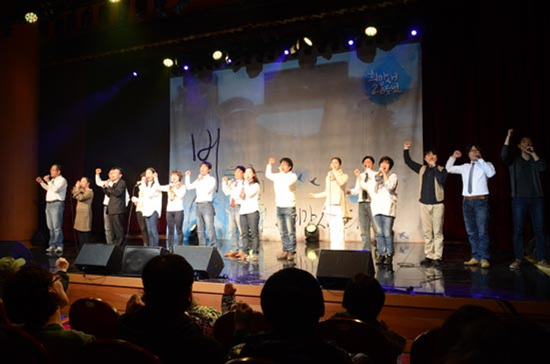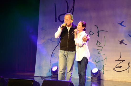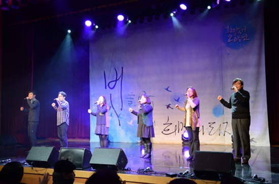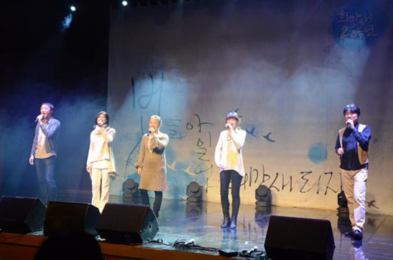 노래극단 ‘희망새’ 창단 20주년 기념공연이 14일 오후 조계사 내 전통문화예술공연장에서 전·현직 단원들과 동료 가수들이 출연한 가운데 열렸다.