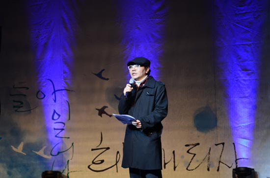▲ 지난 20년의 역사를 돌아보며 인사말을 하는 조재현 희망새 대표. “희망새 20년의 역사와 더불어 각자의 삶을 등에 메고 / 더디더라도 끊임없이 가 볼까 합니다 / 새롭기를 주저 말고 다르기를 두려워 않고 / 그저 조그마한 우리 안의 변화들을 꾀하며 / 지금과는 전혀 다른 세상으로 가는 길을 찾아 / 그렇게, 오늘을 딛고 또 한 걸음 내딛으려고 합니다 / 더 큰 우리, 여러분과 함께” [사진-통일뉴스 류경완 통신원]