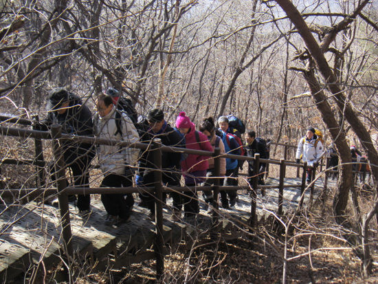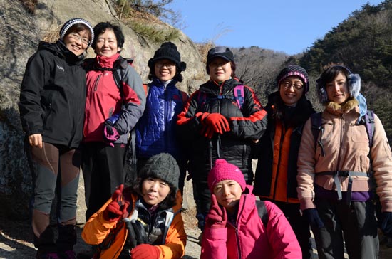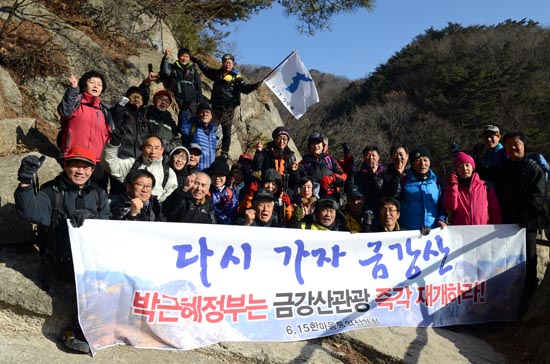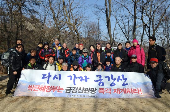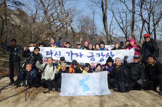 신년 첫 산행이므로 전원 완주에 의의를 두자는 권오헌 회장의 제안으로 이 날은 A, B팀 구분 없이 모두가 함께했다. 중간 중간 기념사진을 찍고 준비한 막걸리와 안주, 컵라면 등을 나누며 휴식을 취했다. 이번에는 사무국에서 새로 준비한 ‘금강산 관광 재개’를 촉구하는 펼침막이 돋보였다.
