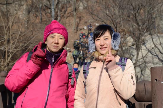 ▲ 리정애 회원과 오사카에서 작년에 이어 두 번째로 산행에 참가한 동생 정수 씨. 따뜻한 곳에서 온 정수 씨에겐 눈과 얼음이 있는 겨울 산이 못내 신기하다. [사진 - 통일뉴스 류경완 통신원]