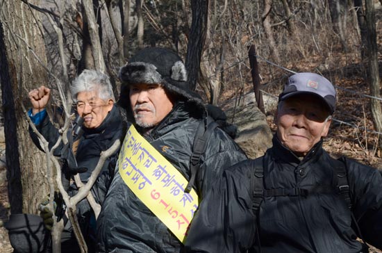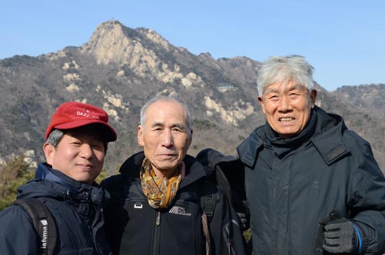 ▲ 통일뉴스 이계환 대표 (왼쪽). 6.15산악회 최고령 기록을 갈아치우고 있는 류기진 선생(90세, 가운데)은 여전히 산행팀 맨 앞에서 산을 오르고, 군중 속에서 모든 일을 다 잘 하고 항상 솔선해서 모범을 보여야 한다고 강조한다. 작년부터 산행이 부쩍 힘에 부치는 양원진 선생(86)도 이 날은 길이 험하지 않다는 권오헌 회장의 꼬임(?)에 빠져 일행과 완주했다. [사진 - 통일뉴스 류경완 통신원]