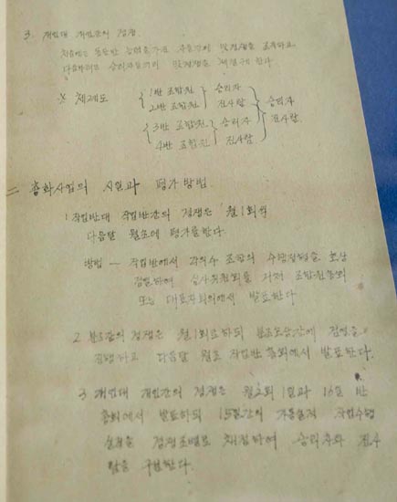 “포전담당제를 분조의 구체적 실정에 맞게 실시하고 매일 로력일 평가사업을 정확히 진행하며 농업근로자들에게 일한 것만큼, 번 것만큼 분배몫이 정확히 차례지도록 하여야 한다.”