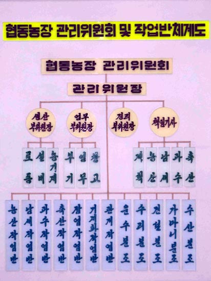 북한에서 농업의 기본단위인 협동농장의 관리운영은 농장관리위원회가 담당한다. 협동농장 생산조직의 기본단위는 작업반이다. 협동농장의 작업반은 일정한 경지, 노동력 및 작업도구를 가지고 계획목표로 부여된 연간 생산과제를 수행한다. 작업반은 몇 개의 분조로 다시 나눠져 있으며 분조 단위로 농사를 짓는다.
