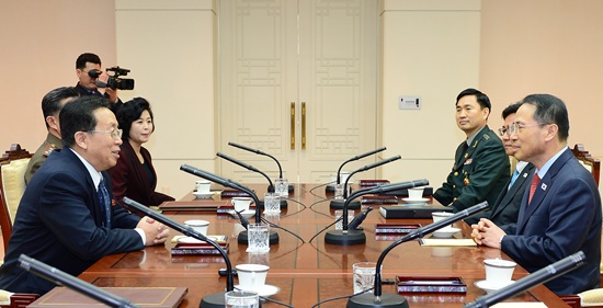 ▲ 남북 고위급 접촉이 12일 오전부터 판문점 우리측 평화의 집에서 열리고 있다. 회의 시작에 앞서 양측 수석대표들이 인사말을 하고 있다. [사진제공-통일부]