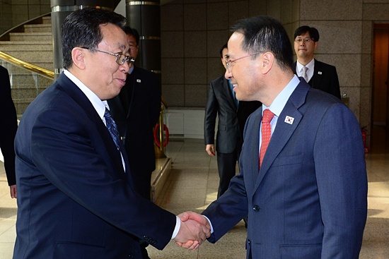 ▲ 김규현 우리측 수석대표(오른쪽)가 원동연 북측 단장(왼쪽)과 악수하고 있다. [사진제공-통일부]