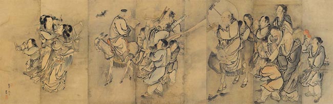 먼저 오른쪽의 무리에서, 외뿔소를 탄 노자(老子)가 일행을 선도하고 그 뒤로 두건을 쓴 종리권(鍾離權), 두루마기에 붓을 든 문창(文昌), 복숭아를 손으로 받쳐 든 동방삭(東方朔)이 보이고, 술에 취해 몽롱한 눈으로 호리병을 들여다보는 이철괴(李鐵拐)와, 민머리에 강인한 인상을 풍기는 여동빈(呂洞賓)도 보인다. 가운데 부분에서 흰 당나귀를 거꾸로 탄 장과로(張果老), 딱딱이를 치는 조국구(曹國舅), 어고간자(漁鼓簡子:竹筒)와 술통을 든 한상자(韓湘子)가 있다.