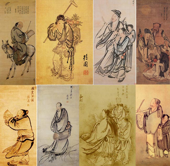 하지만 그중에서도 그림의 소재로 많이 다루어졌던 대표적인 신선은 종리권(鍾離權), 여동빈(呂洞賓), 장과로(張果老), 한상자(韓湘子), 이철괴(李鐵拐), 조국구(曹國舅), 남채화(藍采和), 하선고(何仙姑) 등의 팔선(八仙)이다.