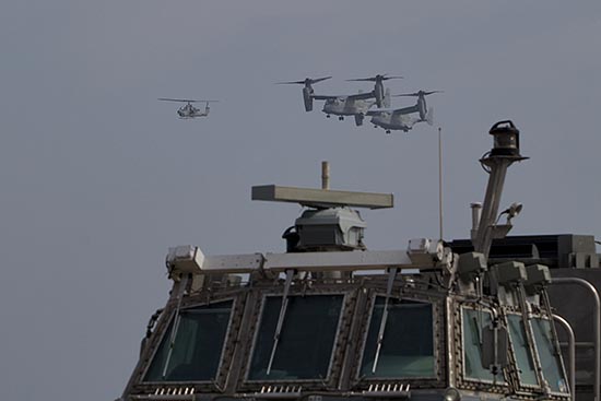 ▲ 육지로 수송할 미 3해병기동여단 대원들을 태우고, USS강습상륙함정인 본험 리처드함에서 이륙한 오스프리(MV-22). [사진-통일뉴스 박귀현 기자]