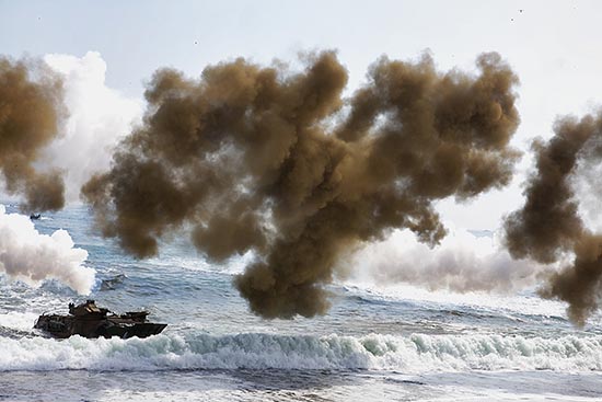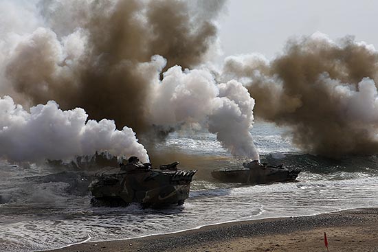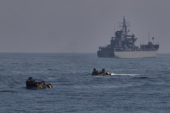 ▲ 한국 해병대원과 미 3해병기동여단 대원을 태운 한국형상륙돌격장갑차가 해안으로 접근하고 있다. [사진-통일뉴스 박귀현 기자]