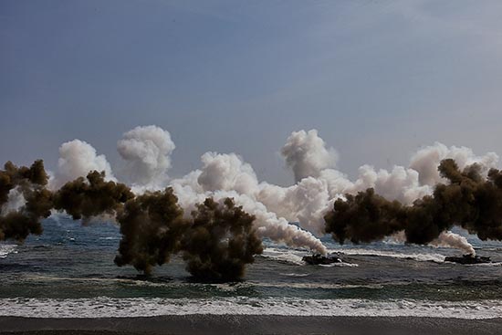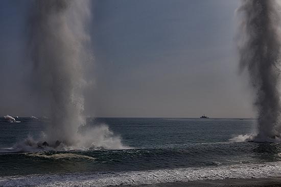 ▲ 폭격에 물기둥이 솟는 해안가. [사진-통일뉴스 박귀현 기자]