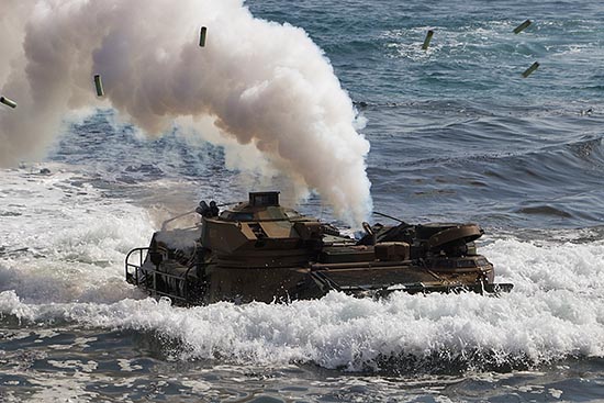 ▲ 연막탄을 쏘며 해안 상륙을 시도하는 한국형상륙돌격장갑차(KAAV). [사진-통일뉴스 박귀현 기자]