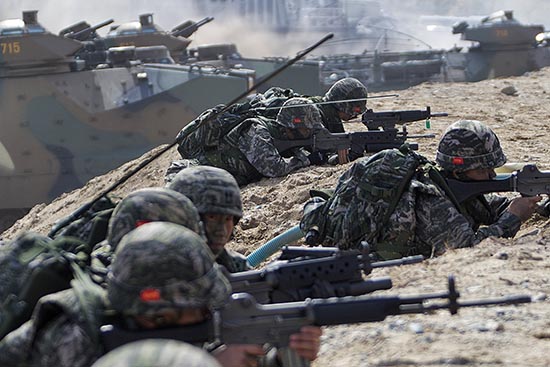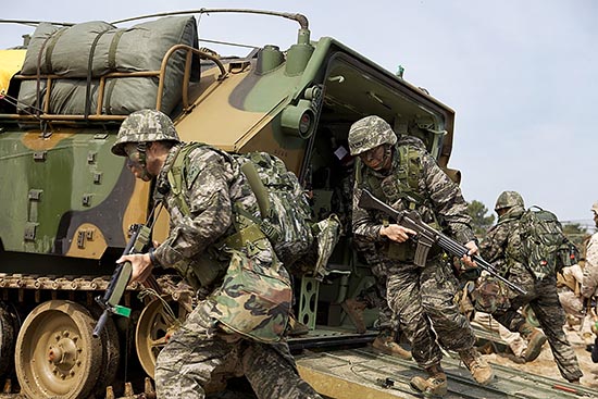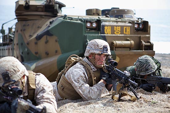 ▲ KAAV(한국형돌격장갑차)를 타고 해안에 상륙해 교두보를 확보한 한.미 해병대원들이 전방 경계를 하고 있다. [사진-통일뉴스 박귀현 기자]