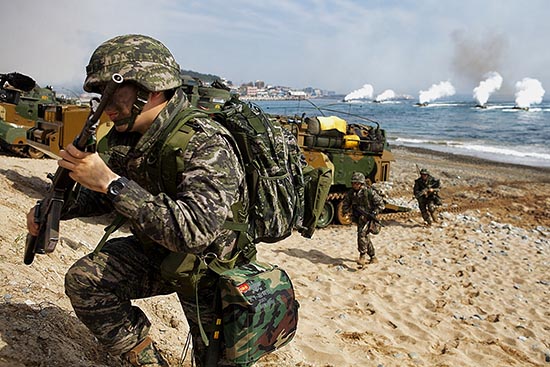 ▲ 해안으로 내린 한국 해병대원들과 미 제3해병기동여단 대원들이 전방 경계를 하고 있다. [사진-통일뉴스 박귀현 기자]