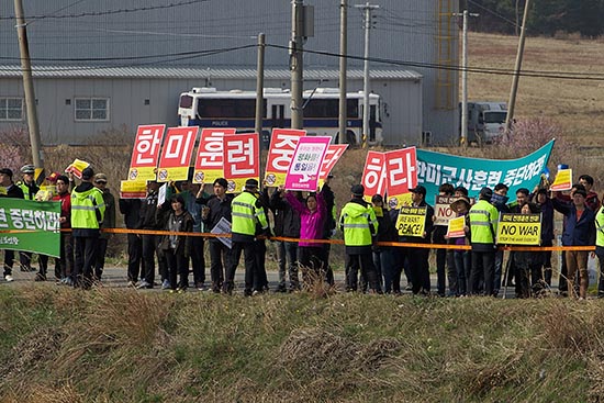 ▲ ‘전쟁반대 평화실현 국민행동’ 소속 200여명이 이날 포항 조사리해변 일대에서 훈련중단을 촉구했다. [사진-통일뉴스 박귀현 기자]