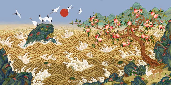 넓은 황해를 중심으로 오른쪽에 복숭아나무를 배치했다. 한번 먹으면 천년을 산다는 천도복숭아가 주렁주렁 달려있는 이 복숭아나무를 반도(蟠桃)라고 부른다. 복숭아나무는 ‘무릉도원, 이상세계’의 상징이기도 하고 일반 사람들에게는 ‘불로장생, 신선세계’로 수용된다.