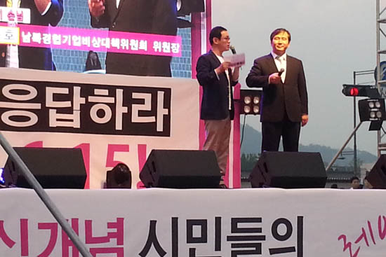 남북경협기업비상대책위원회(남북경협비대위)는 13일 오후 7시부터 9시 30분까지 서울 광화문 광장에서 개그맨 노정렬 씨의 사회로 6.15남북공동선언 14돌 기념행사를 개최했다.