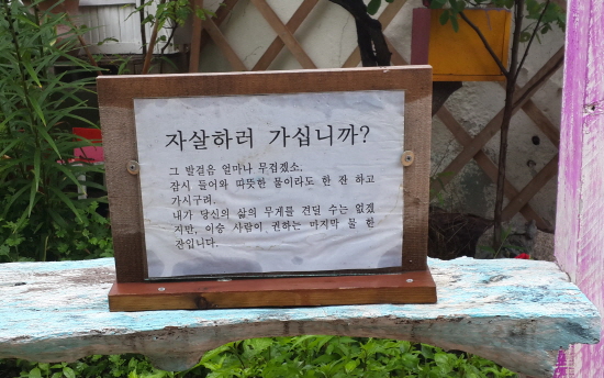 회룡역에서 출발하여 주택가를 거쳐 산 아래 이르렀다. 등산길 초입에 있는 회룡탐방지원센터 근처에서 뜻하지 않는 공고판을 보았다. 그 제목은 <자살하러 가십니까?>. 현실에 힘들었던 몸을 자연의 아름다움 속에 맡기며 에너지를 충전하는 곳이라 생각했던 곳에 역설적인 공고판이 서 있음에 순간 나는 놀랐다.